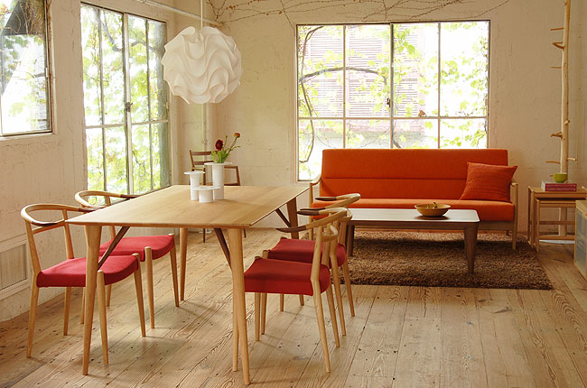 WOC-131の背もたれの曲線と丸テーブルや、楕円形のテーブルと合わせるのも良いと思います。同じ曲線なので統一感が出ますし、柔らかい雰囲気も出しやすくなります。