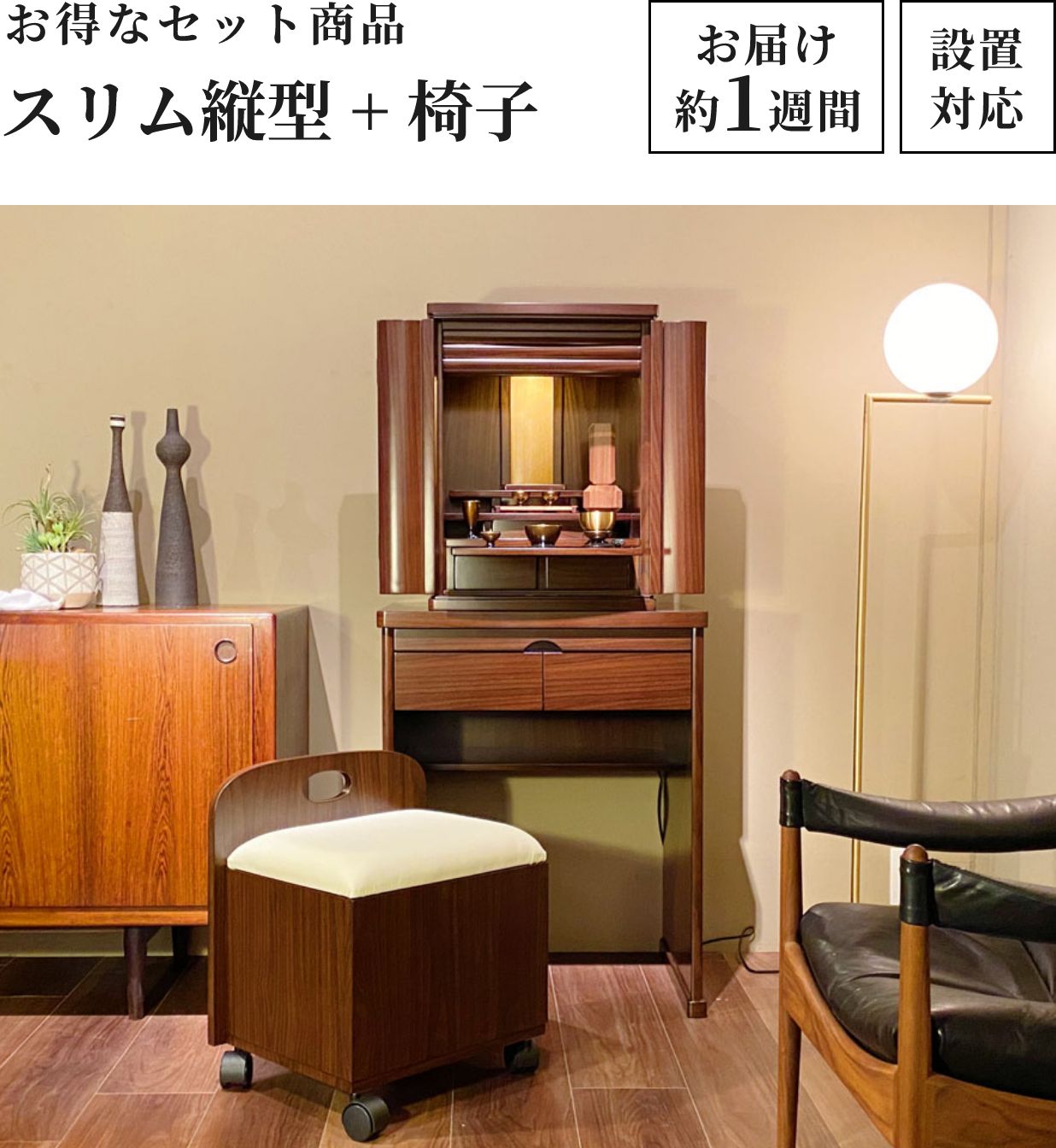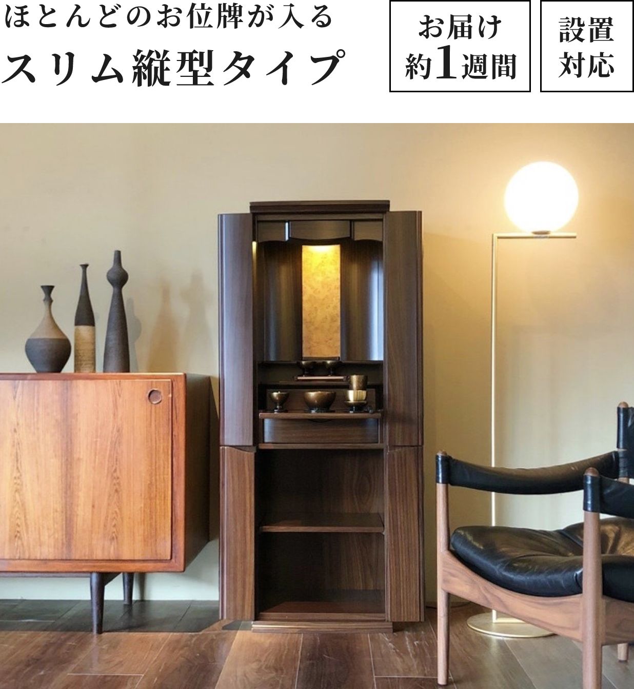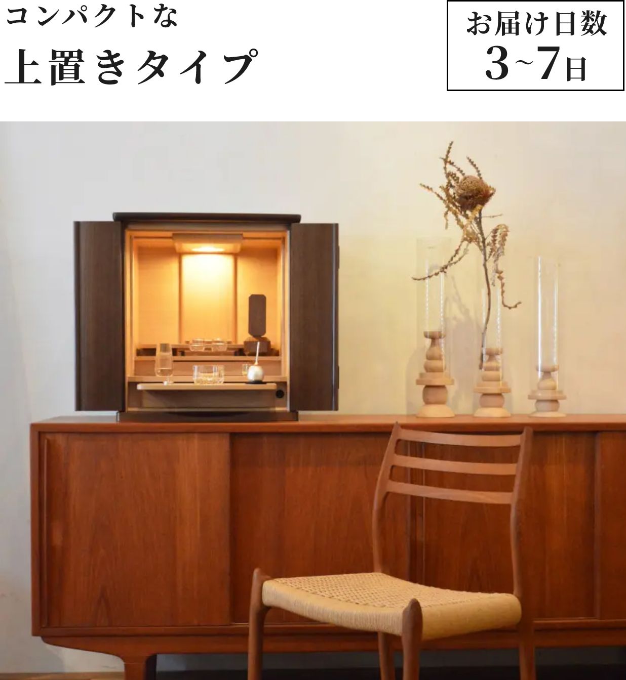 いま、暮らしに合うコンパクトサイズが求められています。ボードや棚に置ける上置きタイプや、正座やスツールを置いて拝めるロータイプ、マンションにおすすめのスリムなハイタイプなど用途に合わせたサイズ展開も豊富です。