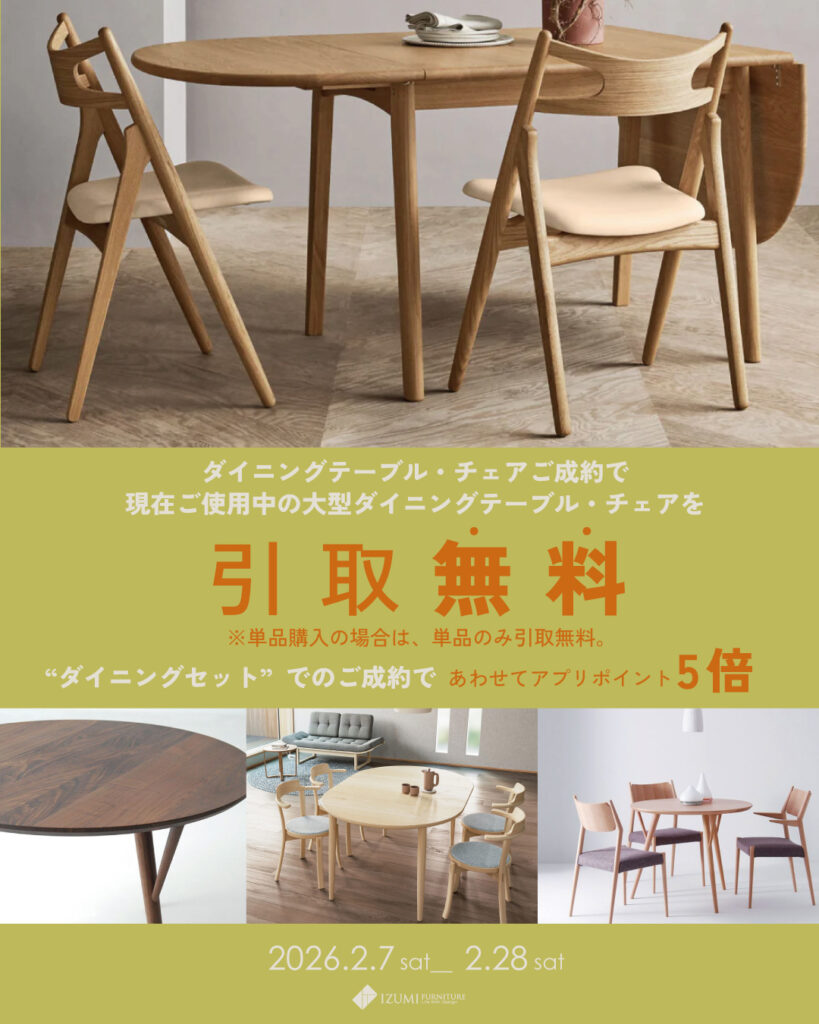 企画期間中(2.7〜2.28)、ダイニングテーブル・チェアをご購入の方は、今お使いのダイニングの引き取り料が無料!