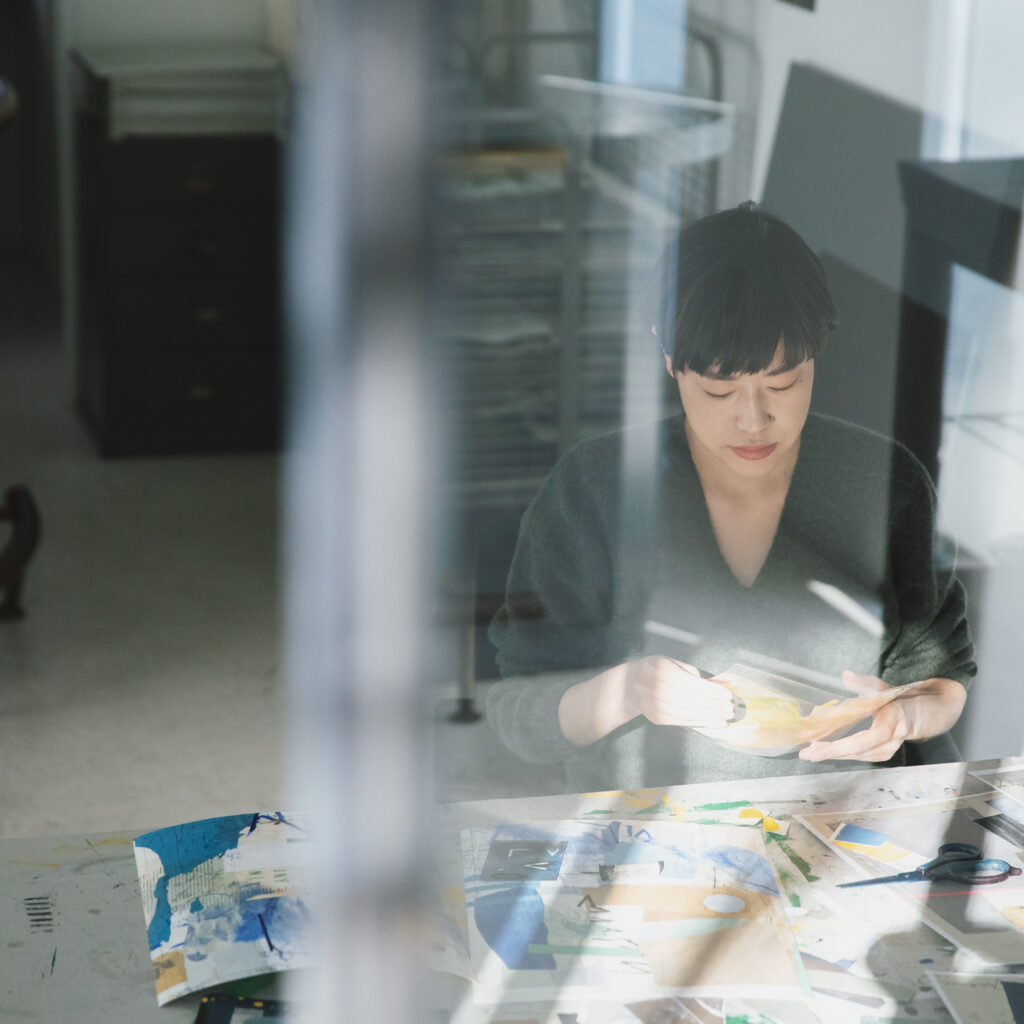 古い紙や切手、マスキングテープなど、様々な素材を重ね合わせる「コラージュ」という手法で、どこか懐かしく、けれどどこにもない新しい風景を描き出します。